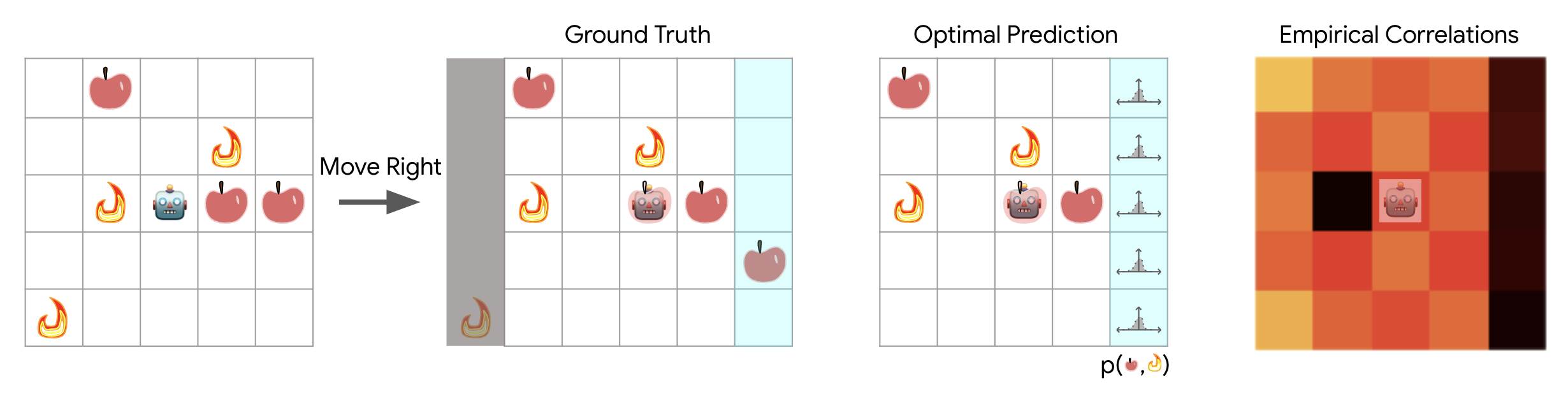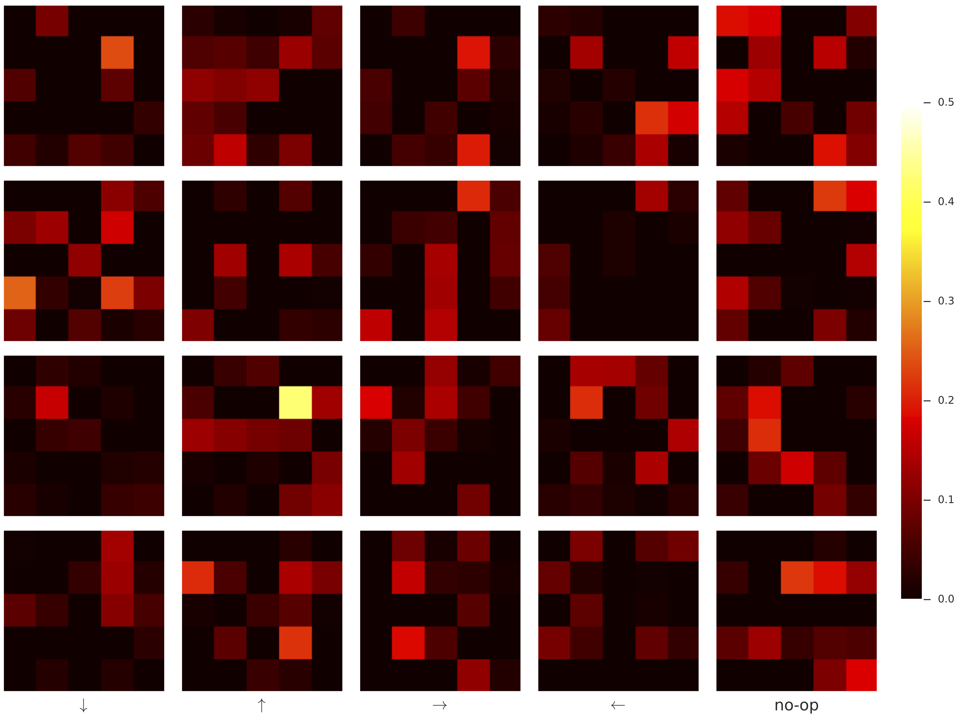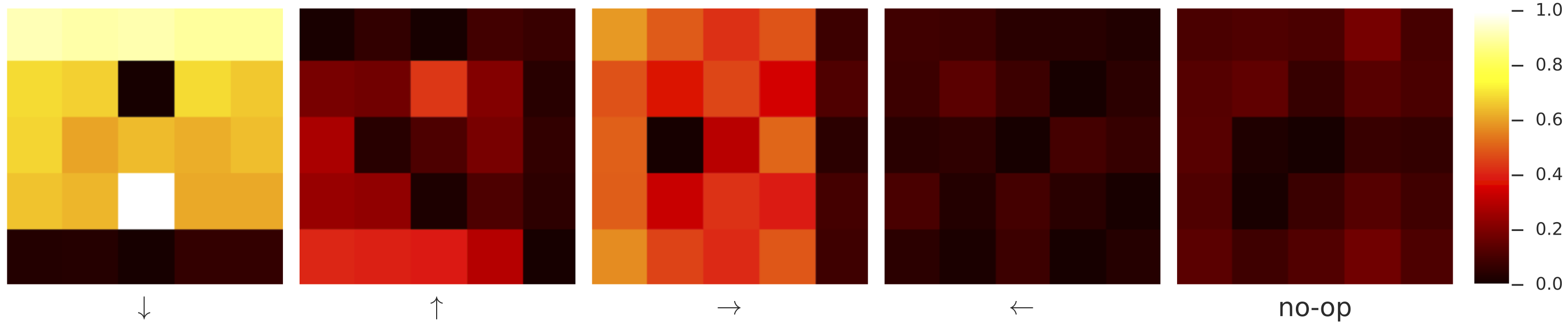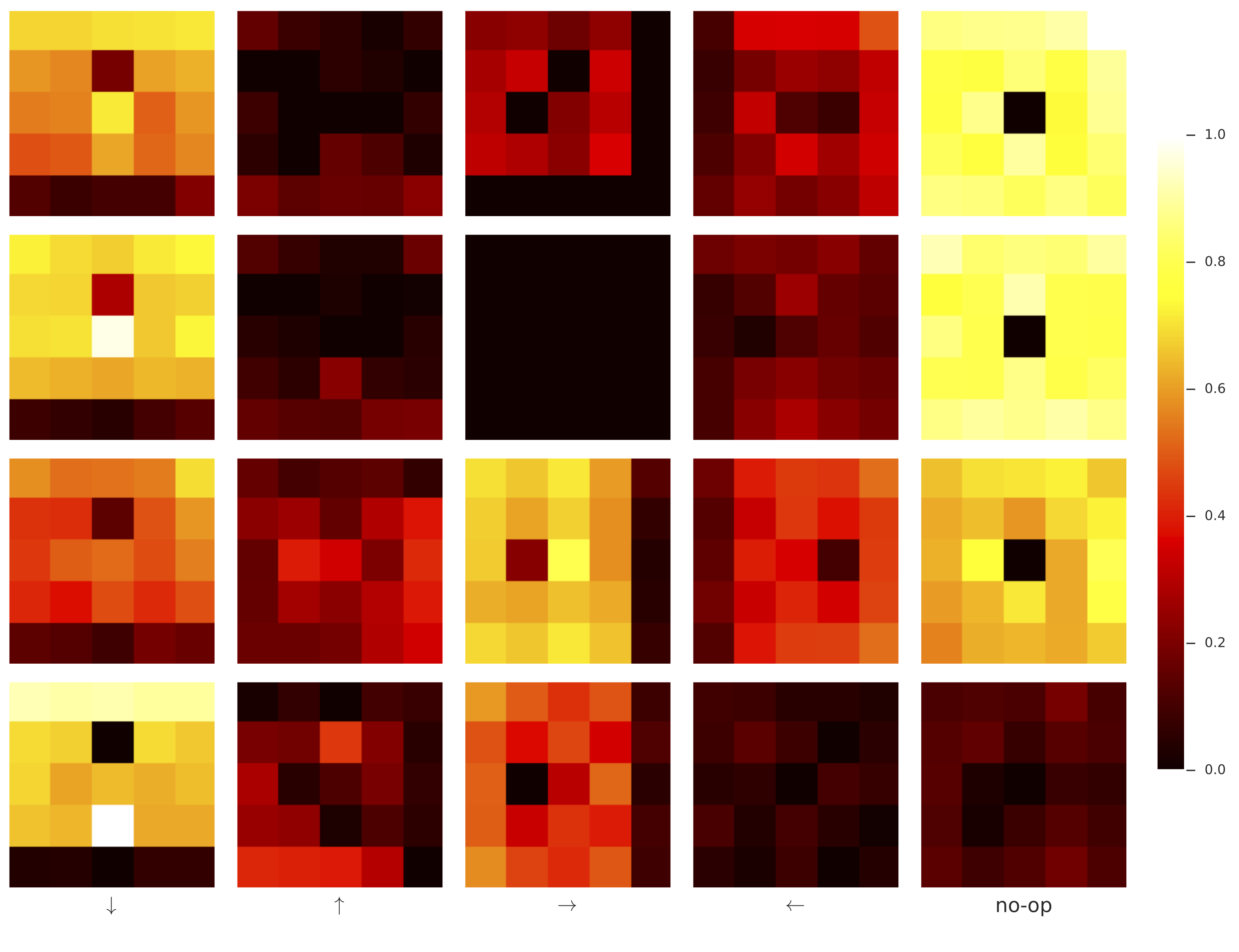 Here, the world model clearly only learns reliable transition maps for moving down and to the right, which is sufficient. Qualitatively, we found that the convolutional world models learned with peek-probability close to were “best” in that they were more likely to result in accurate transition maps--similar to the cart-pole results indicated earlier.