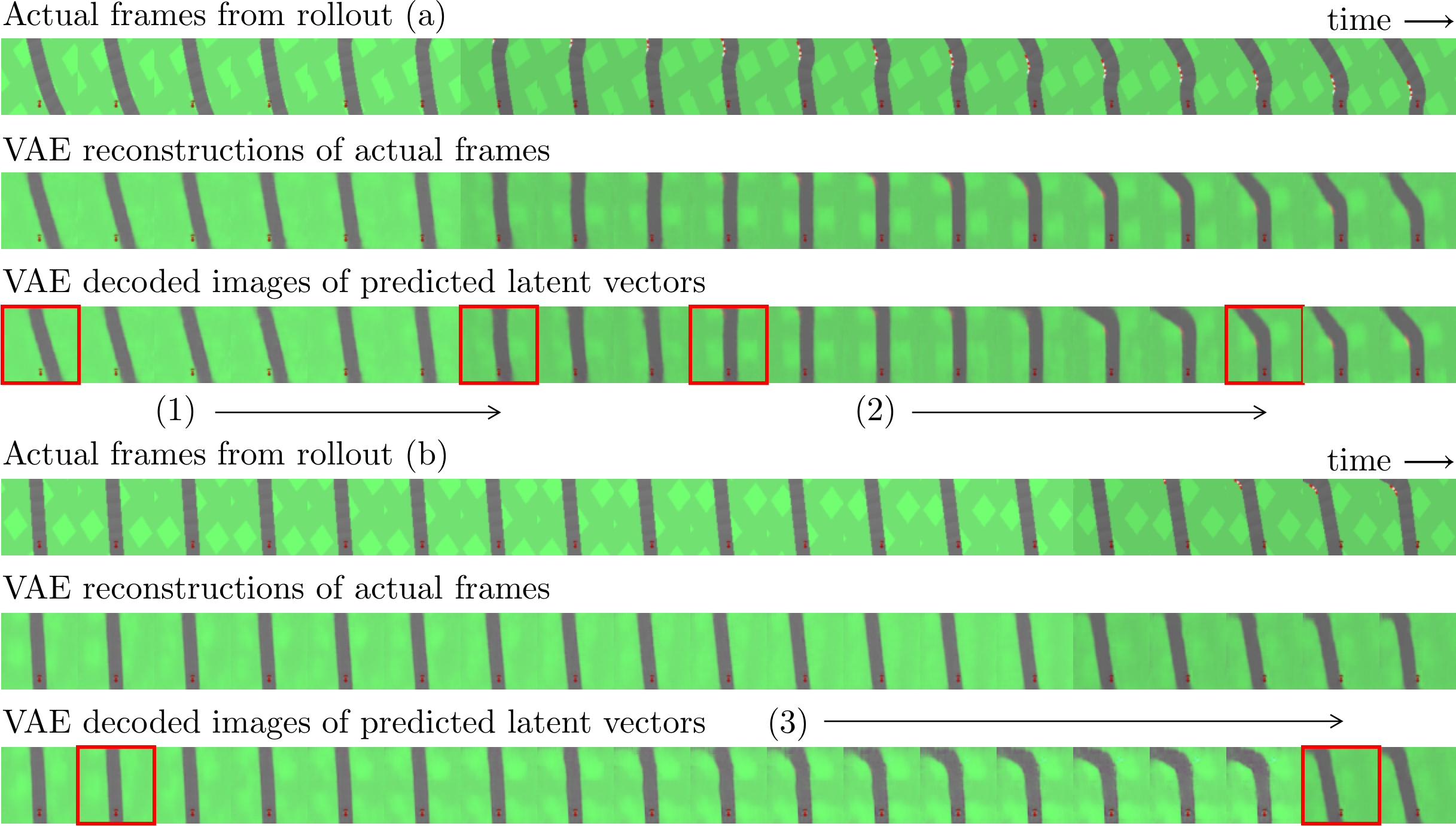 Our world model, , a small feed forward network with a hidden layer, outputs the change of the mean latent vector , conditioned on the previous observation (actual or predicted) and action taken (i.e ). We can use the VAE's decoder to visualize the latent vectors produced by , and compare them with the actual observations that the agent is not able to see (See figure above). We observe that our world model, while not explicitly trained to predict future frames, are still able to make meaningful action-conditioned predictions. The model also learns to predict local changes in the car's position relative to the road given the action taken, and also attempts to predict upcoming curves.