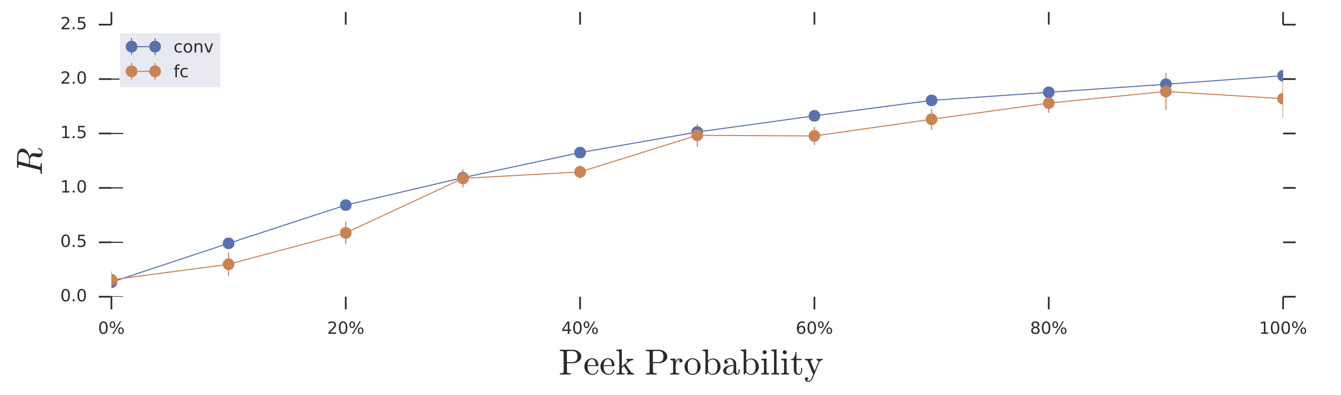 For our numerical experiments we compared two different world model architectures: a fully connected model and a convolutional model (See Appendix for architecture details). Naively, these models are listed in increasing order of inductive bias, but decreasing order of overall capacity ( parameters for the fully connected model, learnable parameters for the convolutional model)--i.e., the fully connected architecture has the highest capacity and the least bias, whereas the convolutional model has the most bias but the least capacity. As in the cart-pole tasks, we trained the agent's policy and world model jointly, where with some probability the agent sees the ground truth observation instead of predictions from its world model. The performance of these models on the task as a function of peek probability is provided in the figure below: