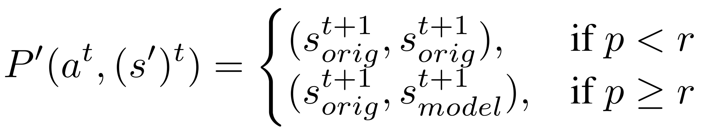 To show this, consider an MDP with states , transition distribution , and reward distribution we can create a new partially observed MDP with 2 states, , consisting of both the original states, and the internal state produced by the world model. The transition function then switches between the real, and world model states with some probability :